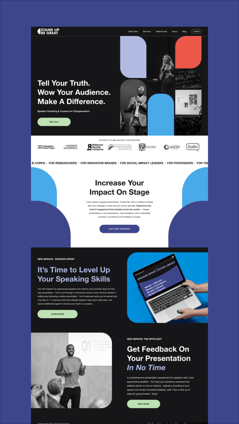 Stand Up Be Great equips leaders, executives, and nonprofits with stronger presentation and public speaking skills through online courses and 1:1 coaching.